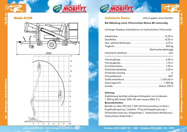 Egal, ob Sie auf der Suche nach einem Teleskoplader für den Baumbeschnitt, für die Dachrinnenreinigung, Dreharbeiten, Wartungs- und Installationstätigkeiten o.ä. sind: Die Mobi-A250 Arbeitsbühne ist stets eine gute Wahl. Die seitliche Reichweite des Teleskopladers liegt bei 11,4 Metern und der Arbeitskorb mit seinen Maßen von 1,4 auf 0,7 Metern lässt sich zusätzlich zum unbegrenzten Schwenkbereich noch einmal um zweimal 45 Grad drehen. Mit einem Gesamtgewicht von 2.400 Kilogramm gehört diese Hebebühne zu den Leichtgewichten ihrer Größenklasse. Beachten Sie aber dennoch, dass das Zugfahrzeug für eine Anhängelast der Kfz-Schein Ziffer 28 zugelassen sein muss. Die Mobi-A250 Anhänger-Teleskop-Arbeitsbühne verfügt zudem über einen 230-Volt-Stromanschluss direkt im Korb, eine Kugelkopfkupplung, Stützenüberwachung, sowie eine hydraulische Abstützung.