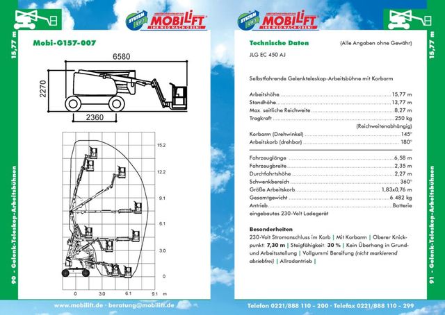 Die Mobilift G157 (Gelenk-Arbeitsbühne 15,7m 250 KG) ist eine selbstfahrende Gelenkteleskopbühne, die Reichweite, Tragkraft und Präzision kombiniert und sich damit für anspruchsvolle Innen- und Außeneinsätze eignet. Auf Basis der bewährten JLG EC 450 AJ Plattform bietet die Maschine eine Arbeitshöhe von 15,77 m und eine maximale seitliche Reichweite von 8,27 m, sodass auch schwer zugängliche Stellen an Fassaden, Dächern oder Hallenkonstruktionen zuverlässig erreicht werden.