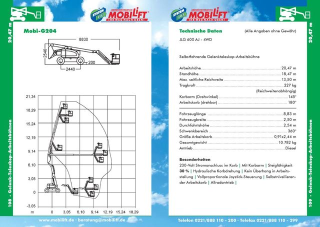 Die selbstfahrende Gelenkteleskop-Arbeitsbühne mit dem Namen Mobi-G204 erreicht 20,47 Meter Arbeitshöhe bei einer reichweitenabhängigen Tragkraft von 227 Kilogramm. Damit gehört diese Hebebühne zu den leistungsstärksten Selbstfahrern unseres Katalogs. Die maximale seitliche Reichweite des Teleskopladers liegt bei 13, 50 Metern und der Korbarm lässt sich um 145 Grad drehen. In Kombination mit dem um 180 Grad drehbaren Arbeitskorb bietet Ihnen der Mobi-G204 ein Höchstmaß an Flexibilität für Ihren Einsatz auf der Arbeitshöhe, ohne dass Sie den Hubsteiger in seiner Position versetzen müssen. Komplettiert wird dies zudem durch den Schwenkbereich von ganzen 360 Grad. So bleiben bei der Mobi-G204 Arbeitsbühne keinerlei Wünsche mehr offen.