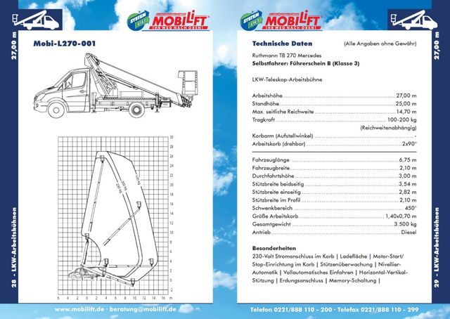 Der MOBILIFT L270-001 gilt als die leistungsfähigste LKW-Arbeitsbühne seiner Klasse mit 3,5 Tonnen zulässigem Gesamtgewicht und einer Arbeitshöhe von 27 Metern. Verbaut sind nur modernste Materialien und innovative Techniken, wie die Korbdrehvorrichtung mit 2 x 90 Grad und einem 450 Grad Schwenkbereich. Das Turmteil „Truss-Tower“ mit leichtem Spaceframe-Design verringert das Gesamtgewicht der Konstruktion und ist dabei äußerst verwindungssteif. Die Korbnivellierung findet hydrostatisch mit fließenden Bewegungen statt und der Arbeitskorb kann jederzeit bequem durch die Einstiegstreppe betreten und verlassen sowie beladen werden.