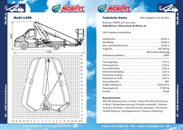 Mit der Mobi L290-01 LKW-Arbeitsbühne zum Mieten bietet sich für Kommunen, Gewerbetreibende und Privatleute ein kompakter Allrounder, der bei vielen Tätigkeiten im Außenbereich zweckdienlich ist. Auf Basis eines 3,5 t-Chassis wird eine maximale Arbeitshöhe von 28,80 m erreicht. Der zugstarke LKW-Dieselmotor entspricht der aktuellen Euro-Norm 6 und darf in allen Umweltzonen zum Einsatz kommen. Ein weiteres Plus ist die schmale und übersichtliche Bauweise, die bei einer Fahrzeugbreite von 2,10 m und einer Länge von 6,94 m gute Rangiermöglichkeiten zulässt; und das schon mit Führerscheinklasse B/3.
