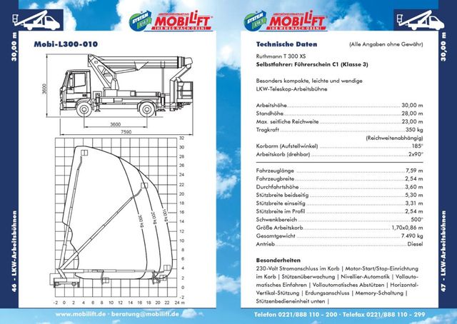 Der Mobilift L300 XS von Ruthmann ist die perfekte Wahl für anspruchsvolle Höhenarbeiten, die sowohl eine beeindruckende Reichweite als auch hohe Tragkraft erfordern. Mit einer Arbeitshöhe von 30 Metern und einer außergewöhnlichen seitlichen Reichweite von 23 Metern können Sie selbst herausfordernde Projekte problemlos bewältigen. Mit einem bemerkenswerten Tragkraft von 350 Kilogramm übertrifft der Mobilift L300 XS die Kapazitäten vergleichbarer 3,5-Tonnen-Fahrzeuge mit gleicher Arbeitshöhe.