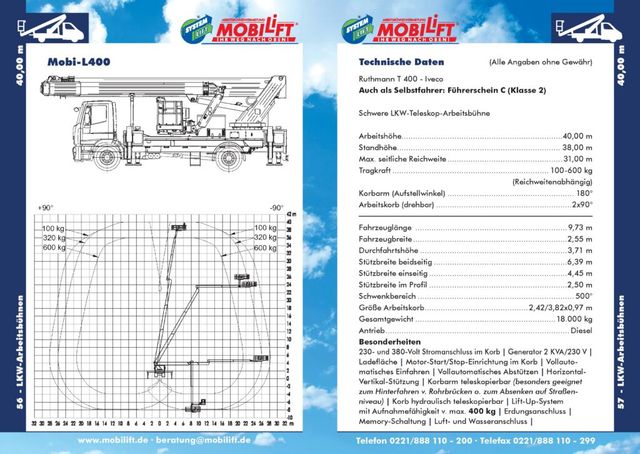 Die Mobilift L400 LKW-Teleskop-Arbeitsbühne ist mit ihren 18.000 Kilogramm alles andere als ein Leichtgewicht unter den Hebebühnen. Doch Ihnen kommt das nur zugute: Durch das hohe Eigengewicht kann der Mobilift L400 reichweitenabhängig bis zu 600 Kilogramm tragen und erreicht eine Arbeitshöhe von 40 Metern. Stabil steht die Hebebühne mit einer beidseitigen Stützbreite von 6,39 Metern auf dem Boden und bietet Ihnen dennoch bei Ihren Arbeiten ein Höchstmaß an Flexibilität. Nehmen Sie in dem 2,42 x 3,82 x 0,97 Meter großen Arbeitskorb selbst schwere Werkzeuge, Arbeitsmaterialien oder Maschinen mit auf die Arbeitshöhe. Auch zu mehreren können Sie mit diesem Hubsteiger am Einsatzort tätig werden. Durch den Drehwinkel des Korbarmes von 180° sowie einem zweimal 90° drehbaren Arbeitskorb erreichen Sie so flexibel und problemlos jede noch so verwinkelte Ecke.