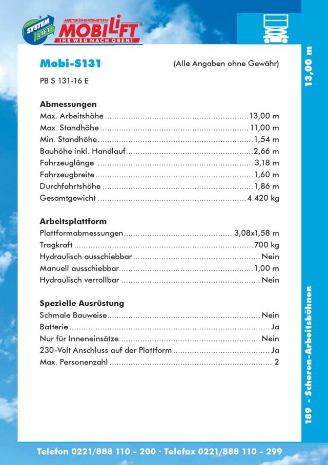 Der Hubsteiger Mobi-S131 ist ein echter Alleskönner. Mit seinen Fahrzeugmaßen von 3,18 Metern Länge, 1,6 Metern Breite und 2,81 Metern Höhe kann er trotz 4.420 Kilogramm Gesamtgewicht problemlos durch schmale Gassen sowie im Straßenverkehr navigiert werden – oder dank eingebauter Batterie auch in Innenräumen.