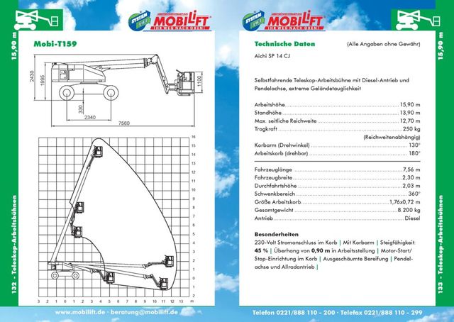 Das Modell Mobi-T159 beschreibt eine selbstfahrende Teleskop-Arbeitsbühne mit Diesel-Antrieb und Pendelachse. Die extreme Geländetauglichkeit dieser Arbeitsbühne zum Mieten macht sie perfekt für Außeneinsätze in schwer befahrbaren Straßen oder unstetem Gelände. Mit einer Fahrzeuglänge von 7,56 Metern, einer Fahrzeugbreite von 2,3 Metern sowie einer Durchfahrtshöhe von 2,03 Metern lässt sie sich problemlos zum Einsatzort navigieren, selbst bei engen Straßen und verwinkelten Ecken. Die Arbeitshöhe dieser Hebebühne umfasst 15,9 Meter und die Standhöhe liegt bei 13,9 Metern. Es handelt sich damit um eines der größeren Modelle in der Teleskopbauweise unserer Mobilift Arbeitsbühnen Vermietung.