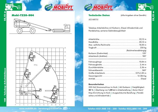 Die Teleskop-Arbeitsbühne zum Mieten kann sogar in Arbeitsbereichen unterhalb der Standfläche eingesetzt werden. Bei einer maximalen Weite von 16 m lässt sich der Korb gut 4 m unter Standorthöhe platzieren. Nach oben erreicht der Mobilift T220-004 20,12 m, wodurch der Arbeitsbereich in 22,12 m Höhe liegt. In seitlicher Lage schafft der Hubsteiger zum Mieten 18 m. Der 0,91×1,83m große Arbeitskorb lässt sich in zwei Stufen um 360° drehen und der Drehwinkel des Korbarms liegt bei 120°. Die maximale Traglast beträgt 230 kg und wird durch die automatische Lastüberwachung kontrolliert. Über den niedrigen Einstieg können zwei Personen problemlos zusteigen und dabei noch Werkzeug und Montagematerial mitführen.