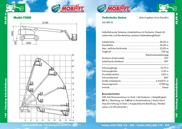 Die Mobilift T280 Arbeitsbühne zum Mieten ist speziell für Einsätze im Außengelände konzipiert. Im ausgefahrenen Zustand schafft sie eine Arbeitshöhe von 28,21 m. Dank Allradantrieb bewältigt der Dieselmotor Steighöhen von 45 °. Der 17.200 kg schwere Hubsteiger zum Mieten erreicht Geschwindigkeiten zwischen 5 und 6 km/h auf ebener Fläche. Doch auch abseits von befestigten Wegen lässt er sich gut zum Einsatzort bringen. Dafür sorgen die schaumgefüllten Geländereifen mit einem Radstand von 3,05 m. Durch die Pendelachse beschränkt sich der Wendekreis auf ein Minimum. Die Bodenfreiheit liegt bei 30 cm, wodurch Einsätze bei jeder Witterung möglich sind. Ein weiteres Plus ist die kurze Einarbeitungszeit, die den Benutzer schnell mit der Bedienung vertraut macht.