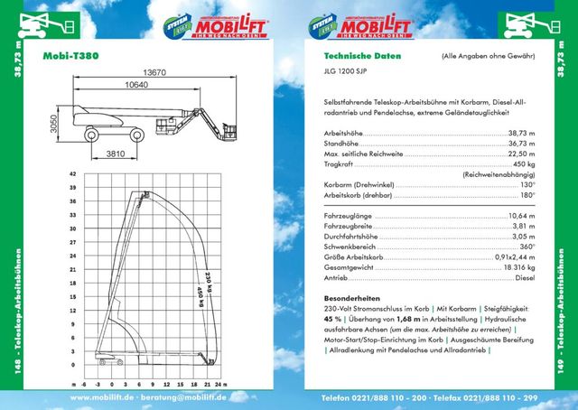 Nicht nur die Arbeitshöhe von fast 40 m machen den Mobilift T380-001 für sämtliche Einsatzzwecke interessant, sondern auch die zulässige Traglast. Diese liegt bei 450 kg, so dass die Mitnahme von schweren Gütern möglich ist. Der Drehwinkel des Korbarms bewegt sich in einem Rahmen von 130°. Der gesamte Schwenkbereich der Arbeitsbühne zum Mieten umfasst 360°. In waagerechter Position kann der Teleskoparm um bis zu 22,5 m ausgefahren werden. Der 0,91×2,44 m große Arbeitskorb bietet auf einer Grundfläche von 2,22 m² ausreichend Platz für zwei Personen und ermöglicht obendrein den Transport von Werkzeugen und weiterem Montagematerial. Im zusammengefahrenen Zustand beträgt die Durchfahrtshöhe 3,05 m. Die Gesamtlänge des Fahrzeugs liegt bei 10,64 m und die Breite beläuft sich auf 3,81 m. Durch die Bauweise und das hohe Eigengewicht ist in allen Lagen ein sicherer Stand gewährleistet. So kommt der Hubsteiger zum Mieten ganz ohne zusätzliche Stützen aus.