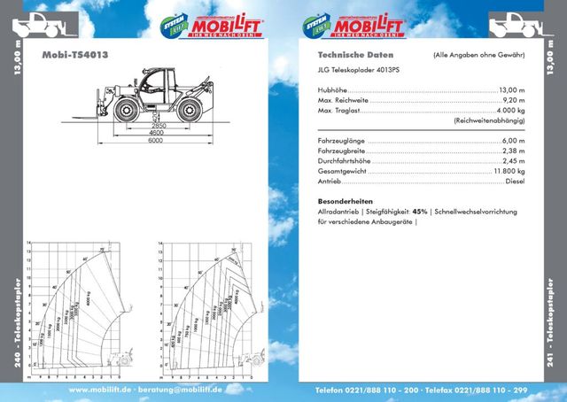 Der Mobilift TS4013 Teleskop-Stapler zum Mieten misst eine Gesamtlänge von 6 m und eine Breite von 2,38 m. Die Durchfahrtshöhe beträgt ohne Beladung 2,45 m. Der Schwenkradius liegt außerhalb der Reifen bei 3,80 m. Somit stellen Engpässe keine großen Herausforderungen dar. In der Praxis überzeugt der Teleskoplader insbesondere auf Baustellen, da er auch bei hoher Zuladung extrem wendig ist. Vier Vorwärts- und drei Rückwärtsgänge ermöglichen einen präzisen und abgestimmten Arbeitsbetrieb. Unterstützt wird dieser durch die gute Rundumsicht aus der Steuerkabine. Die Lenkung lässt sich zwischen Allrad- und Vorderradbetrieb sowie Hundegang variieren. Die Nassscheibenbremsen greifen selbst bei schwierigen Boden- und Witterungsbedingungen. In ausgefahrenem Zustand erreicht der Teleskoparm im Stand eine Hubhöhe von 13 m. Die maximale Reichweite liegt bei 9,20 m. Je länger diese ist, desto geringer wird die zulässige Traglast. Bei einer Reichweite von 4 m liegt diese aber immer noch bei 3000 kg.